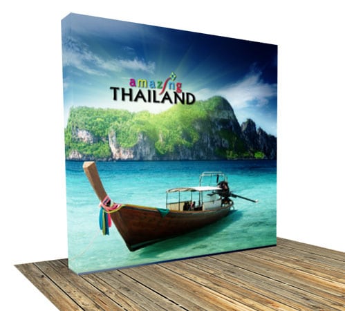 The FabriMural Tension Fabric Pop Up Display above illustrates the versatility of fabric trade show displays. The graphic skins can be wrapped around backwalls, counters, banner stands and more for consistent branding and coloring across all exhibit components.
