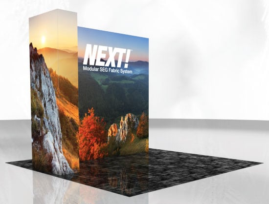 With its wraparound graphic, the NEXT! 10' L-Shaped SEG Display adds visual intrigue and depth to your booth.