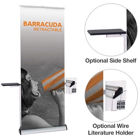 The Barracuda Retractable Banner Stand offers an optional side shelf and wire literature holder.