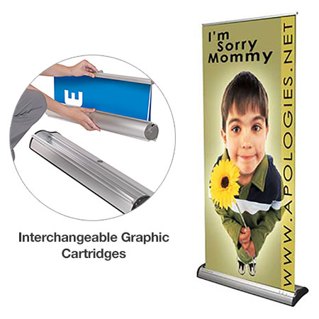 Interchangeable Graphic Cartridges. If you like to change your graphic panel messaging to target different audiences at different shows, but you only want to purchase one hardware unit, a retractable banner stand with interchangeable graphic cartridges is a must. Print as many graphics as you need and keep them safely stored in their own standalone cartridges, then simply swap out the old cartridge with the new one in just a few clicks. Bam! You've got a completely different look for your next show.