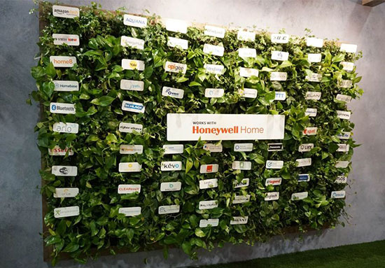 At CES, Resideo's biowall displayed the names of key partners that integrate with the Honeywell Home ecosystem amidst a lush background of over 140 live green plants. Photo courtesy Resideo.