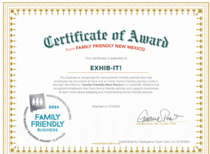 Today EXHIB-IT! received the New Mexico Family Friendly Business Award® at the highest level of recognition: Platinum!