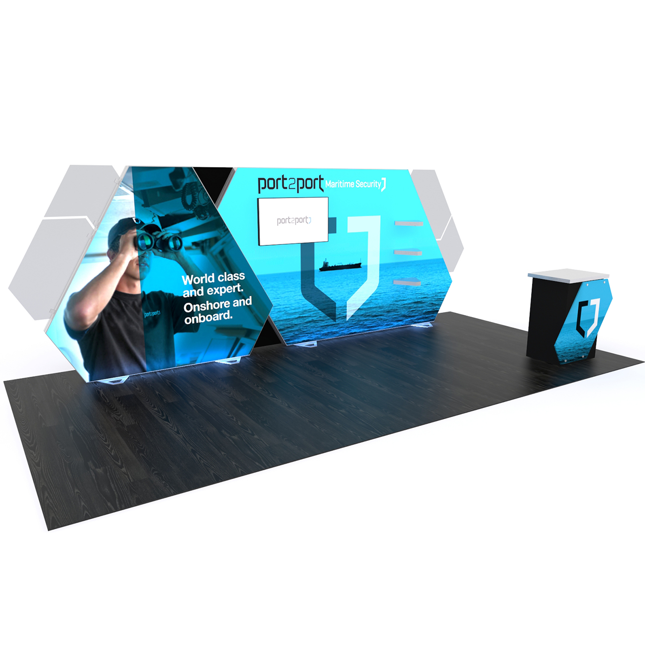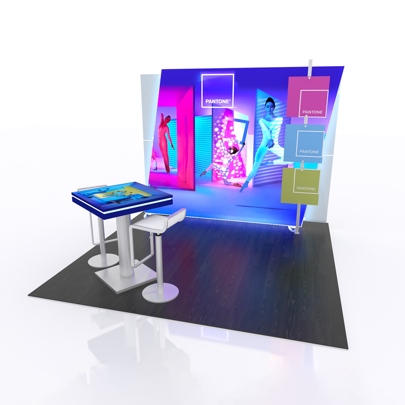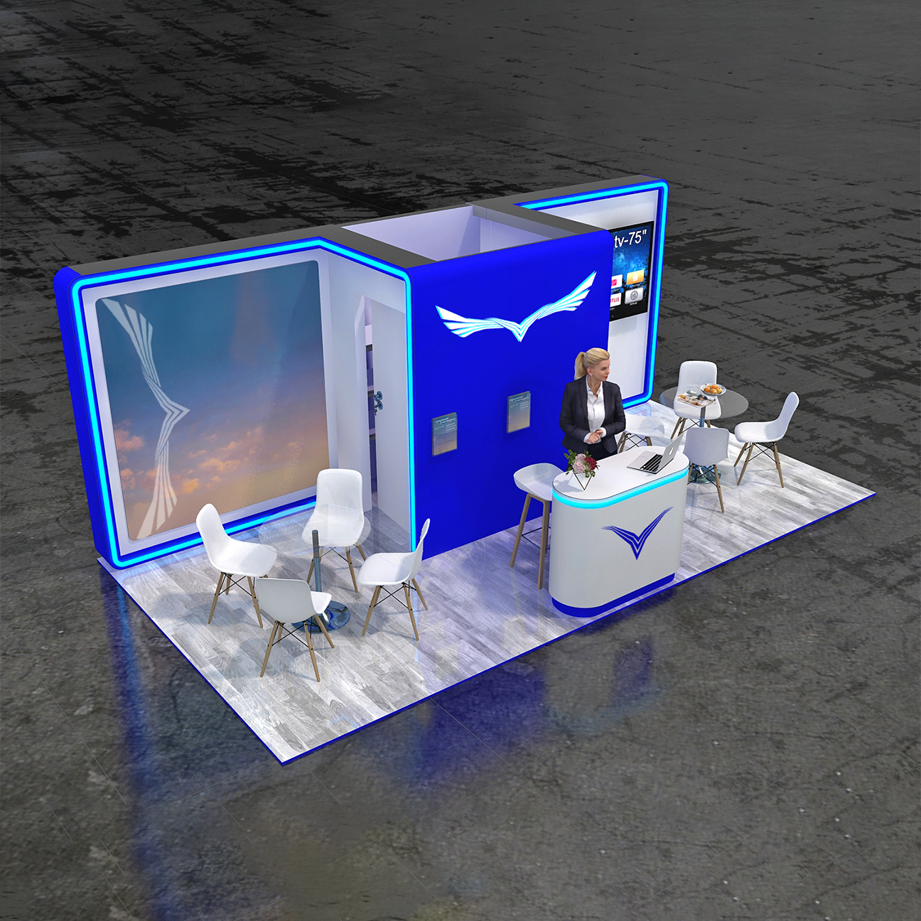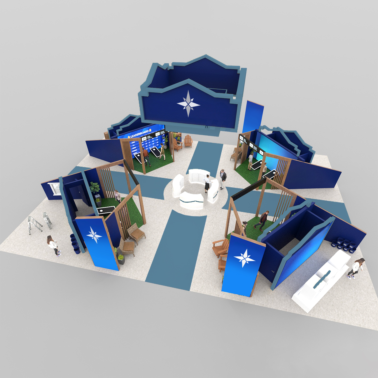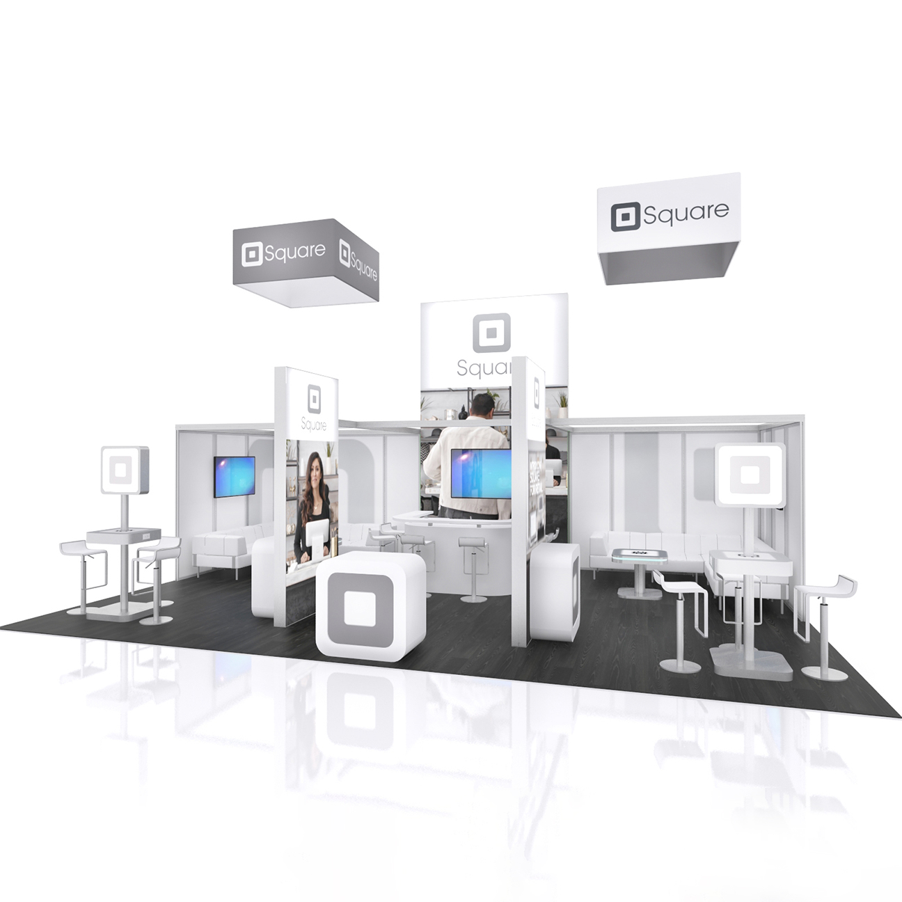 - Example: Booths with video walls and custom branding.