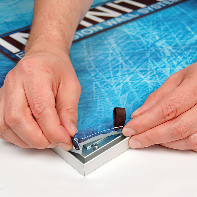 The secret? Create a taught graphic by inserting the SEG into the groove on the frame's perimeter for a flat display's neatly finished corner.