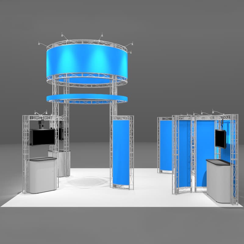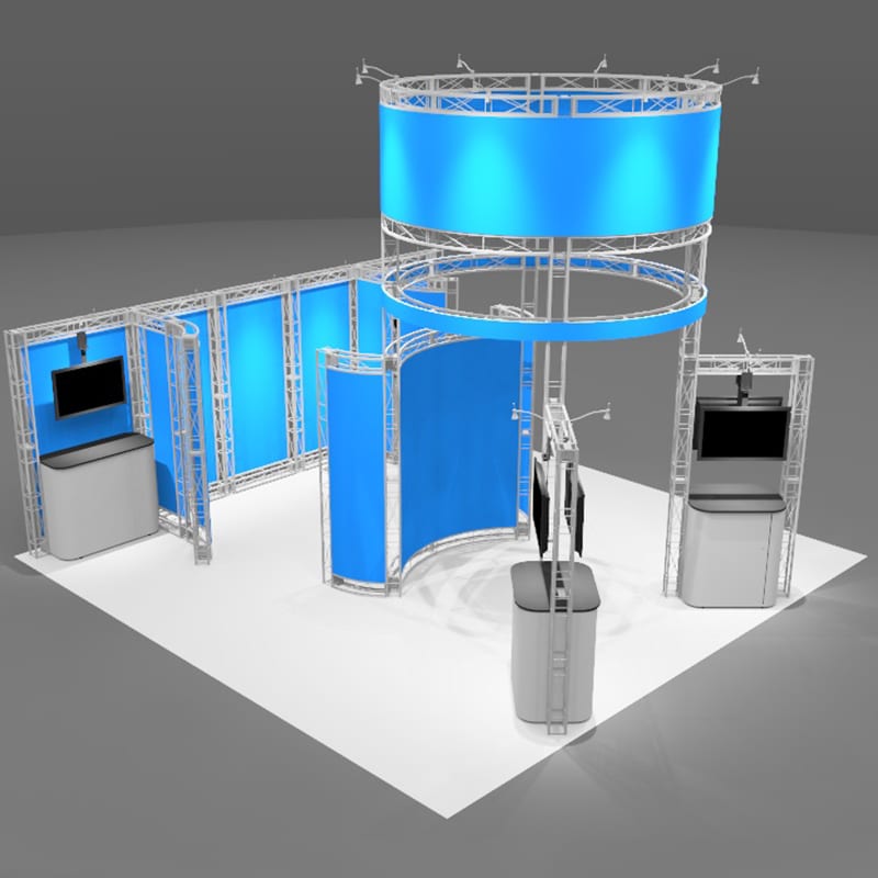 The Sierra 20 x 20 Large Industrial Display is an EZ6 Island Truss system. The features include a 16' high by 10' diameter tower with a large graphic for great exposure from across the trade show floor! Add the vertical truss mount or large Hanging Plasma Mount for even more interaction. This 20 x 20 Large Industrial Display kit includes three counter work station areas and space for a private conference area for customer meetings.