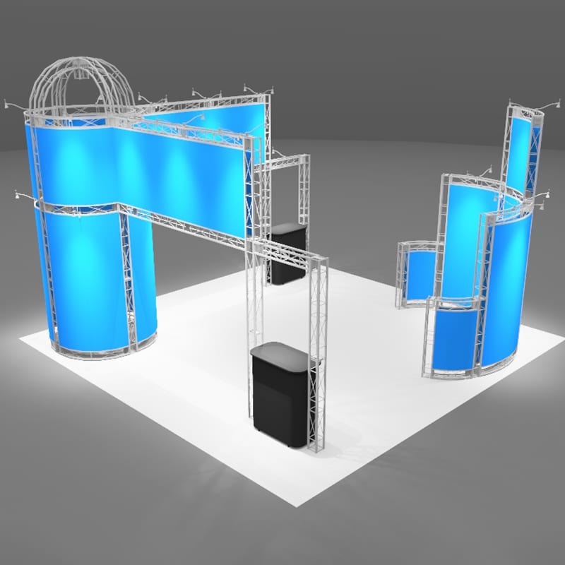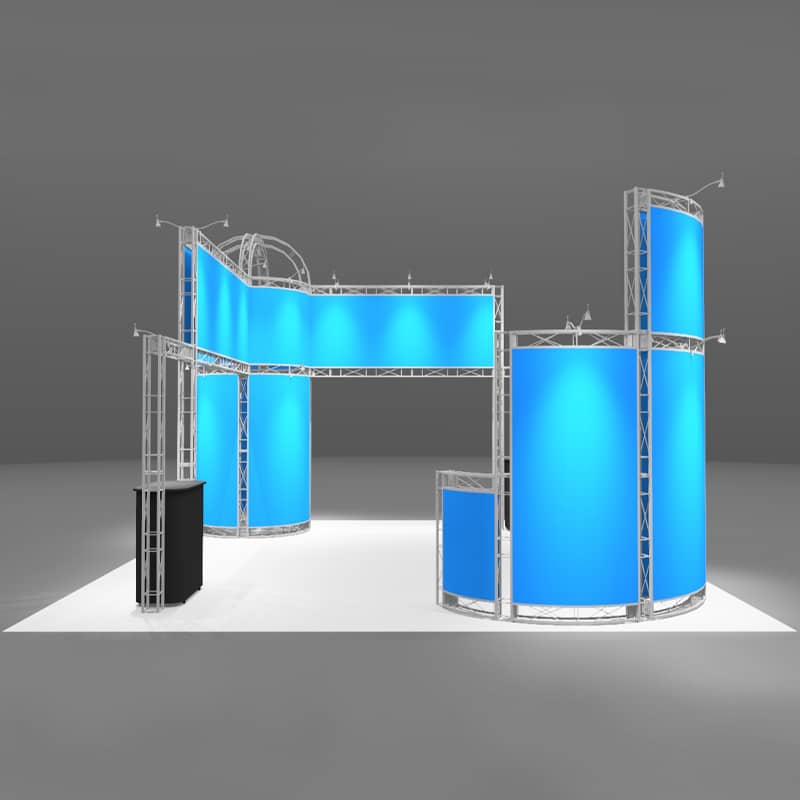 The 20 x 20 Metal Display includes an 18' high round structure and a presentation area perfect for customer interactions, presentations, and product/service demonstrations. This 20 x 20 Metal Display will get you visibility from across the show floor to get the attention of every trade show attendee! With its lightweight and portable, modular frame, set up is easy and you don't need tools. To complete this modular display, add the two counters for workstations.