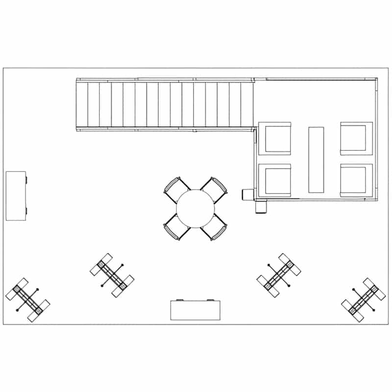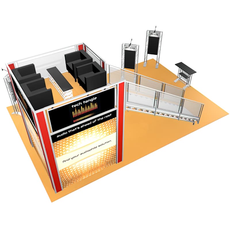 The 20 x 30 Double Deck Display Tech Tangle design is one of our most economical double deck designs. It comes with a deck base of 9 x 9 and a simple straight stairway. Upstairs is your private meeting or retreat area. Downstairs, the two walls create a place for product demonstrations, or you can turn this into a casual meeting area.