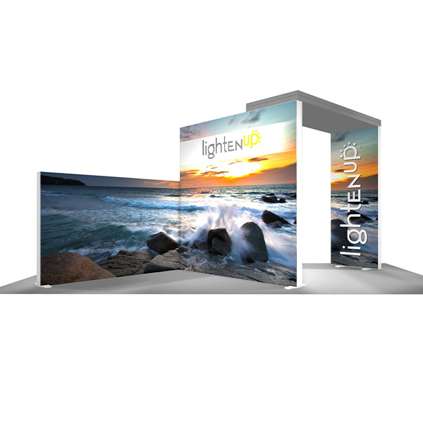 Make a powerful impression with the 20ft LightenUP Backlit Display Kit B—ideal for larger booth spaces and big branding moments. Featuring our double-sided rLIT™ backlit fabric and precision 4K printing, this kit delivers eye-catching visuals with even, vibrant illumination. It’s engineered for ease, with tool-free assembly, integrated lighting, and smart cable management. The PVC frame stays lightweight without compromising strength, and the rotating foot provides reliable support. Comes complete with a carry bag. Prefer a single-sided layout? It’s available on request.