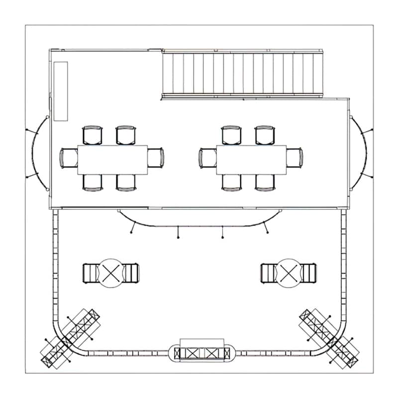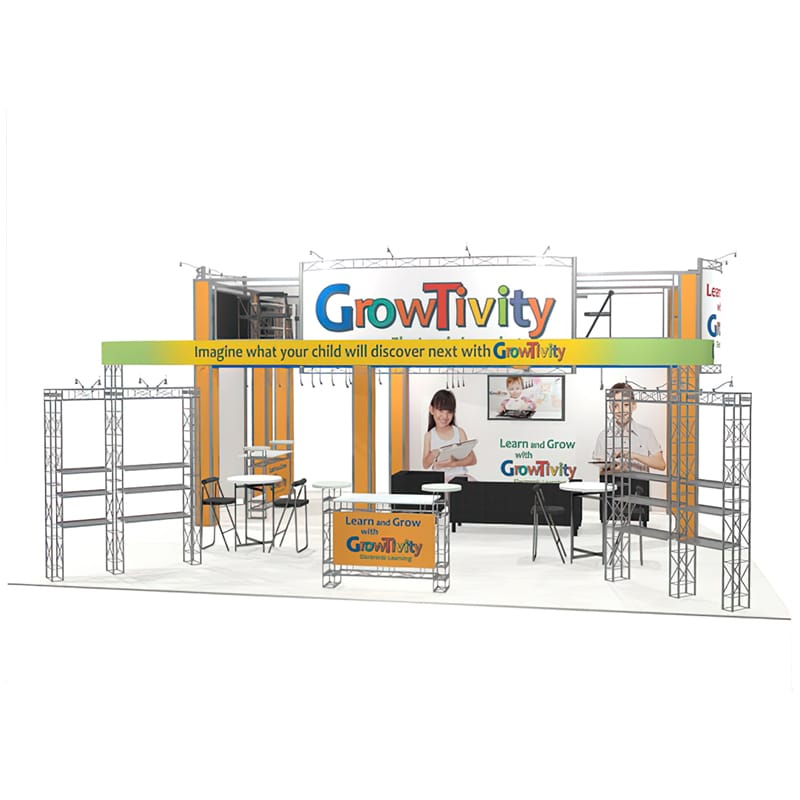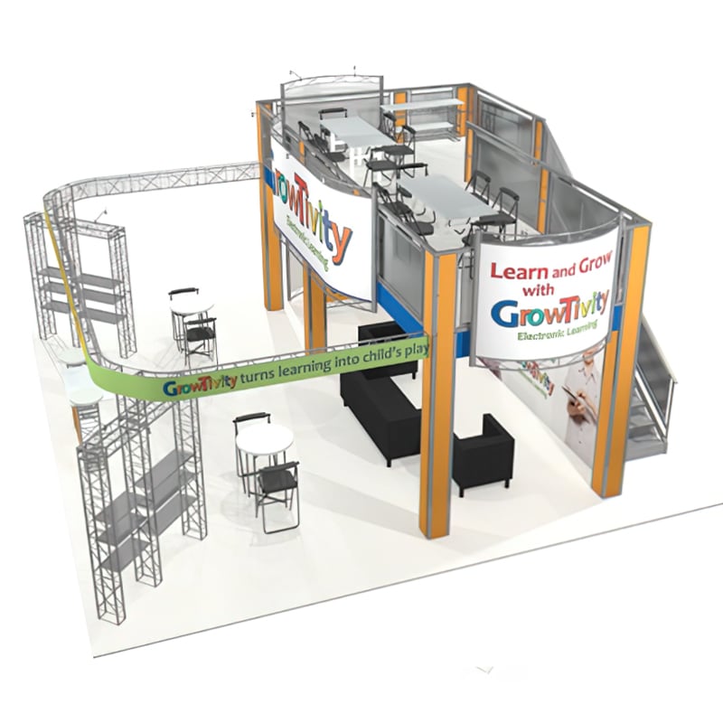 The 30 X 30 Two Story Display Growtivity has a deck with a straight staircase and extended landing area. The stairs are behind a large feature wall, while the landing area is open to walk onto the deck. The upstairs lounge is very spacious, and the downstairs floor plan has a header perimeter of the popular EZ612 truss! Three convex Hyperlite signs mount to the deck for branding.