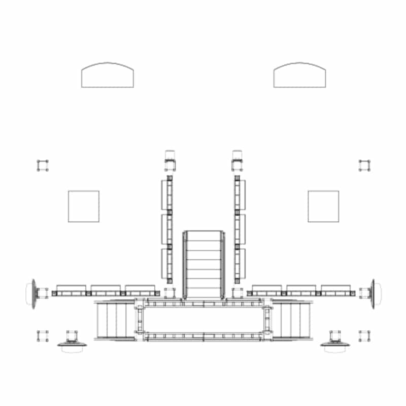 The 30 X 40 Two Story Display Eco-Whats Custom Design utilizes two 13 x 13 decks with a split staircase. Each upper decks is separate so they each have a single deck occupancy with a shared staircase. Downstairs, each side of the floor plan has EZ6 shelving and a product table!