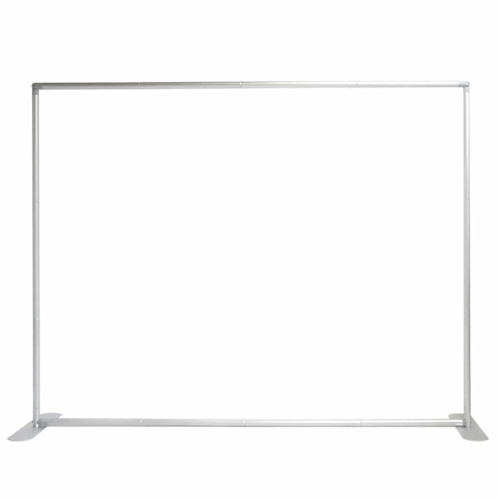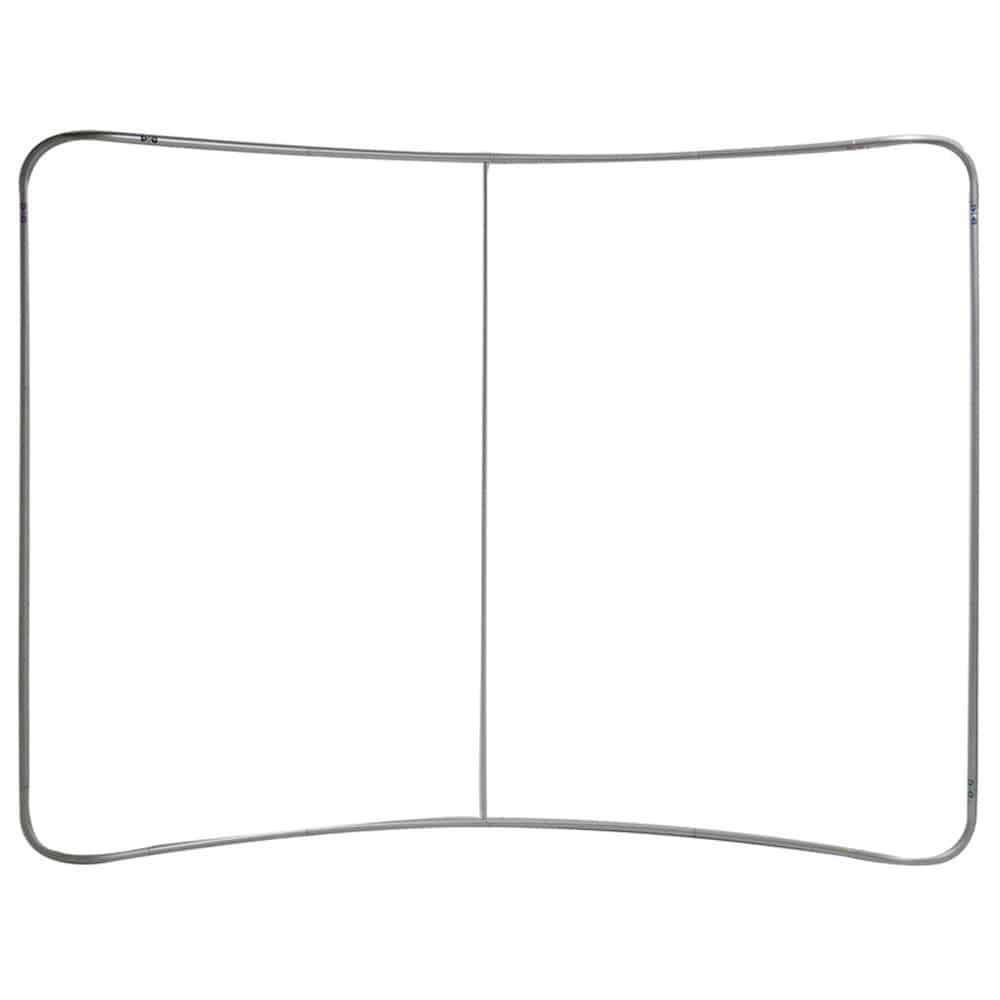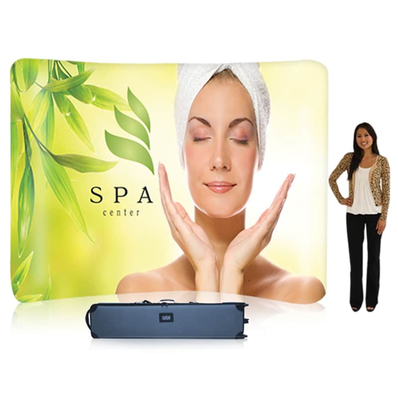 The 8-foot fabric display with option for a curve or straight hardware kit . Select from a single-sided or double-sided graphic that slides over the top of the tubular push-button hardware frame. The graphic has a zipper along the bottom and includes a travel bag.