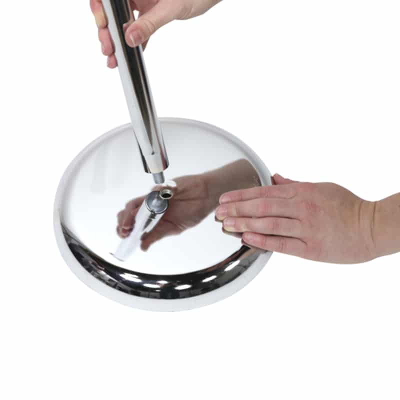- Chrome finish post, circular base, and sign holder