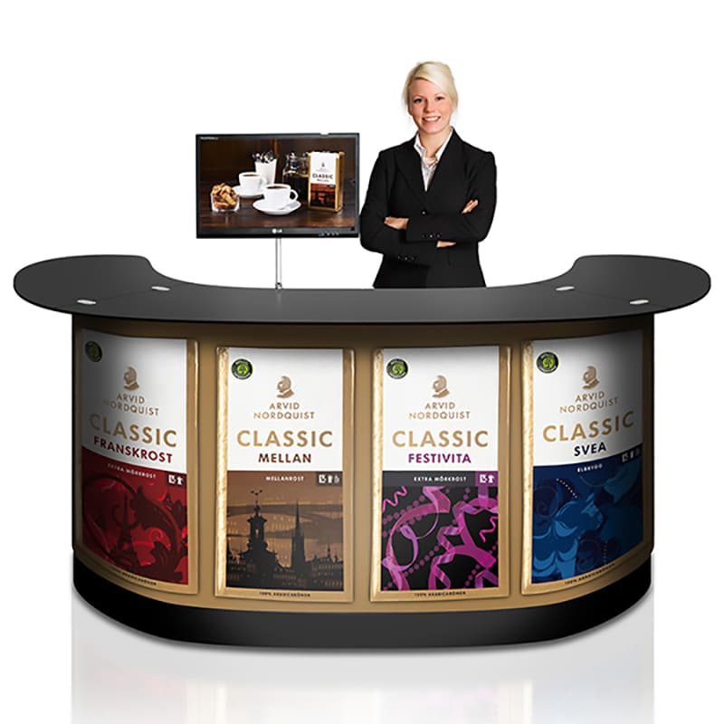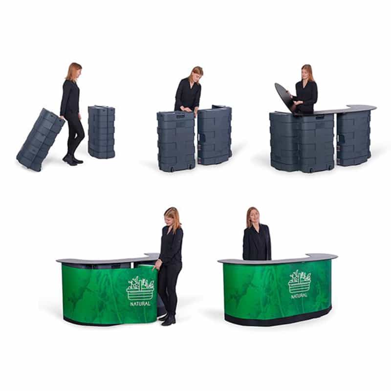 The counter has a distinctive shape and provides a large surface to gather around at your event. Inside, the optional detachable shelves hold your brochures, demo products, or anything else you may want to remove from sight. You can also use the front of the case for extra exposure of your message, or your logo, by adding a graphic wrap. This case will hold most of our pop-up displays with graphics, backlit displays, retractable banner stands, and non-retractable banner stands, as well as your other event displays.