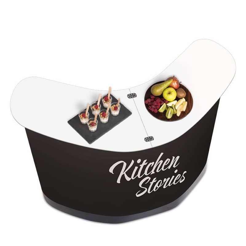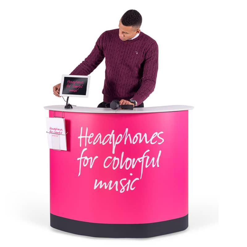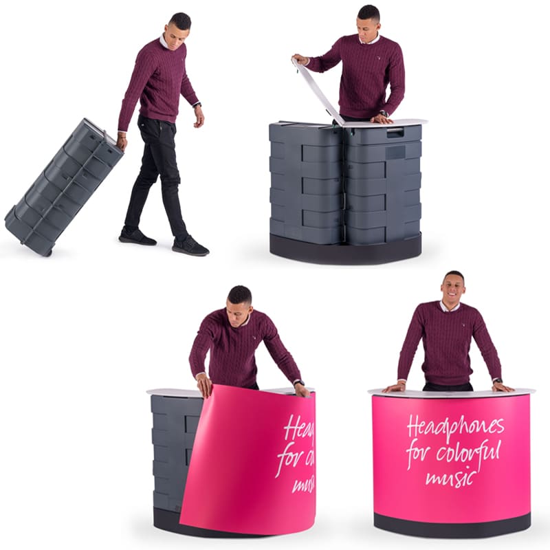 The Case to Podium is a popular conversion counter kit with a large graphic. The unique-shaped counter provides a large surface to gather around at your event. Inside, the detachable shelves hold your brochures, demo products, or anything else you may want to remove from sight. You can also use the front of the case for extra exposure of your message or logo with the added graphic wrap. This case will hold most of our pop-up displays with graphics, retractable and non-retractable banner stands, as well as your other event displays.