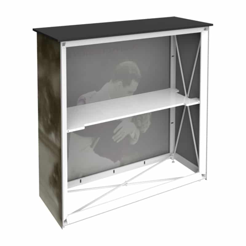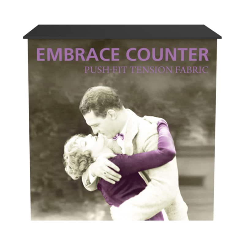 The Embrace Counter is a lightweight and highly portable, sleek, collapsible SEG tension fabric counter display that gives style with minimal effort. The Embrace Counter rectangle shape combines a collapsible white frame and hardware channel bars that hold push-fit fabric graphics. The internal white shelf provides additional storage space. Included with this counter is a laminate countertop. No tools are necessary for assembly on the Embrace Counter.