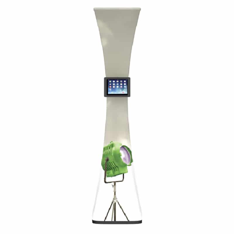 Assembles in minutes! The dye-sub printed graphic narrows at the center where the iPad attaches and provides space at the top for eye-catching branded graphics. iPad is not included.
