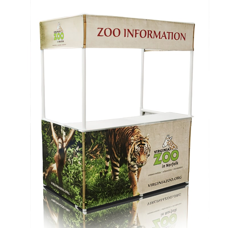This Portable Branded Gazebo-6 Foot Valance shape is a Full Digital Print and is ideal for both foodservice and outdoor or indoor promotions. Includes two counters, and optional casters allow the booth to move in place easily and quickly. Full Digital Printing.