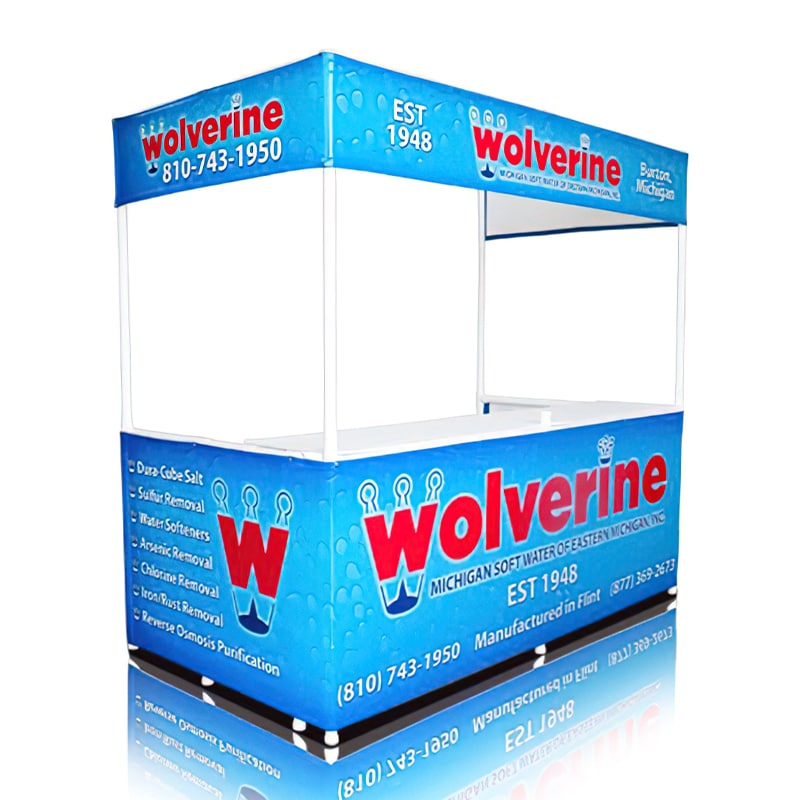 This Portable Branded Gazebo-8 foot Valance shape is fully printed and famous for merchandise sales, indoor or outdoor food and beverage service, and event promotions. This Portable Branded Gazebo-8 foot Valance model includes two front counters and full digital printing.
