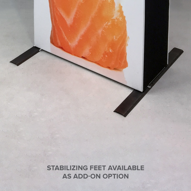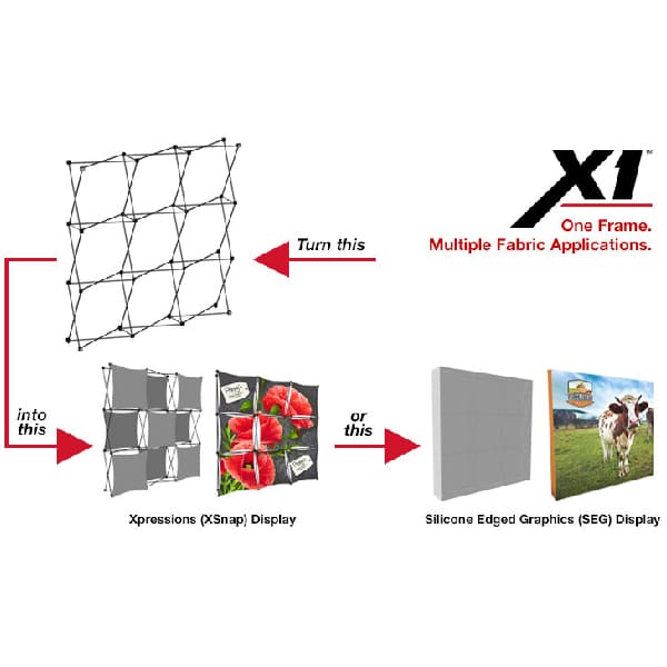 This display's uniqueness over other fabric displays is you can attach a variety of different fabric graphics to the same frame. Your options include Silicone Edged Graphics (SEG), to stretch fabric, to non-stretch material so that you can recycle or extend the life of your existing graphic panels.