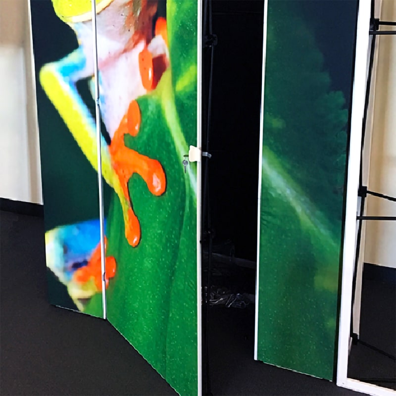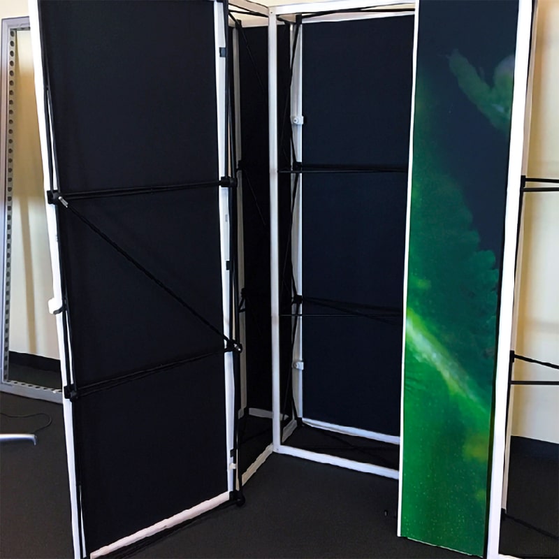 The X1 Modular Display Closet System allows you to attach branded dye-sub fabric graphics to the same frame. You can select from Silicone Edged Graphics (SEG) to stretch fabric and even non-stretch fabric so that you can recycle or extend the life of your existing graphic panels.