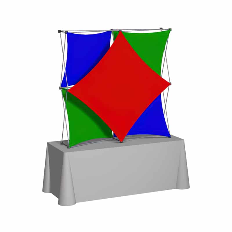 The X1x 2x2 Kit A fabric display sets up in mere seconds, and it's perfect for an on-the-go exhibit. The versatility on this display is unbelievable! Change out one or two graphics, change the configuration, or add accessories for a new look! The large diamond front panel is great for placing your logo branding.